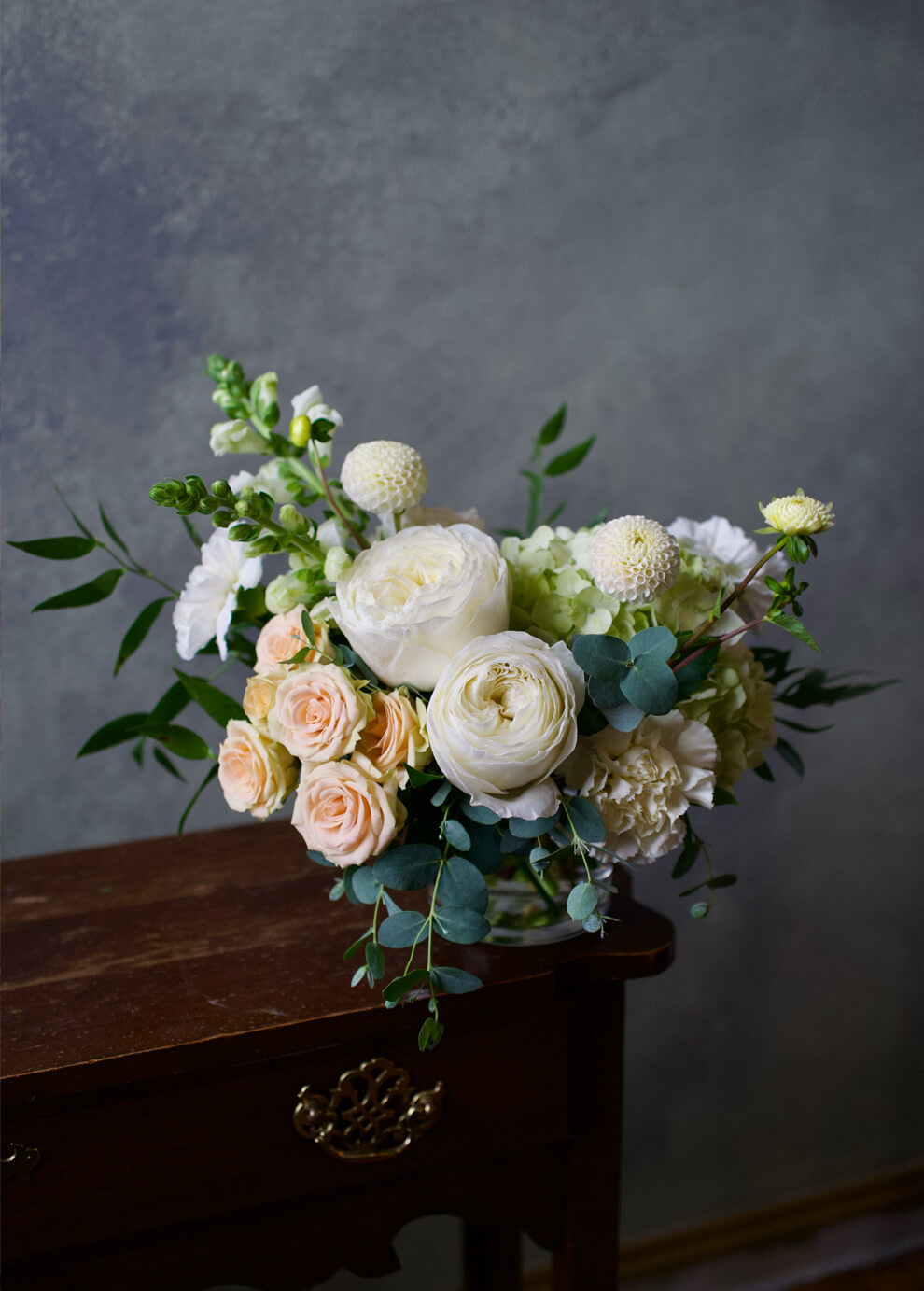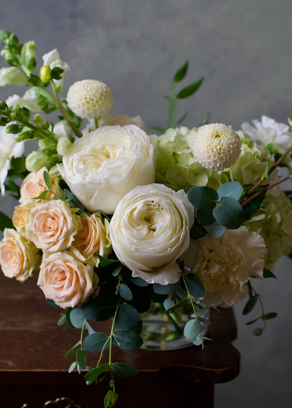 Expertly arranged in a classic low glass vase, each stem is thoughtfully placed to create a lush, garden-inspired composition that radiates sophistication and grace.